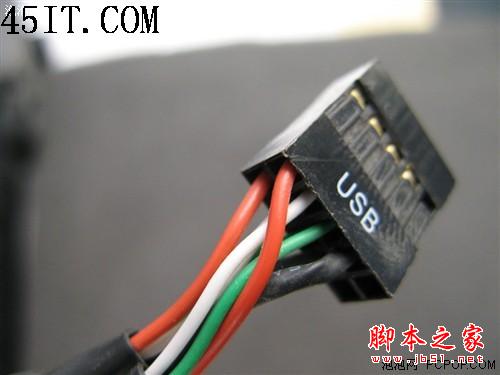 現在一般機箱上的前置USB連線搜是這樣整合型的,上面一共有8根線,分別是VCC、Data+、Data-、GND,這種整合的就不用多說了,直接插上就行。如果是分開的,一般情況下都本著紅、白、綠、黑的順序連接。如上圖這根線,雖然是整合的,但同樣是以紅白綠黑的排序方式。