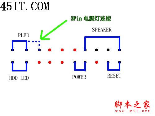 上圖就是華碩主板這種接線的示意圖(紅色的點表示沒有插針),實際上很好記。這里要注意的是有些機箱的PLED是3Pin線的插頭,但是實際上上面只有兩根線,這里就需要連接到3Pin的PLED插針上,如上圖的虛線部分,就是專門連接3Pin的PLED插頭的。