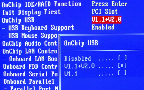 2、硬件對策:如果你無法放棄WINDOWS XP SP2,而不再乎USB 1.1在傳輸上與USB 2.0的那些差異,那么這個(gè)方案適合你,你只要進(jìn)入主板的BIOS,找到USB工作模式的相關(guān)選項(xiàng),僅以AWARD BIOS為例,一般情況下是在Integrated Peripherals欄目中,有一個(gè)USB的端口狀態(tài)設(shè)置ONchip USB,一般有兩個(gè)選項(xiàng):V1.1+2.0 和 V1.1,這樣,我們只需要選擇為V1.1模式,之后所有的USB口將采用USB 1.1模式狀態(tài)工作,而不去識別兼容性比較不理想的各種USB 2.0設(shè)備,這樣雖然傳輸速度上慢一點(diǎn)點(diǎn),但卻可以從根本上解決這個(gè)問題,你也無須多次重新安裝操作系統(tǒng),少走了很多彎路。