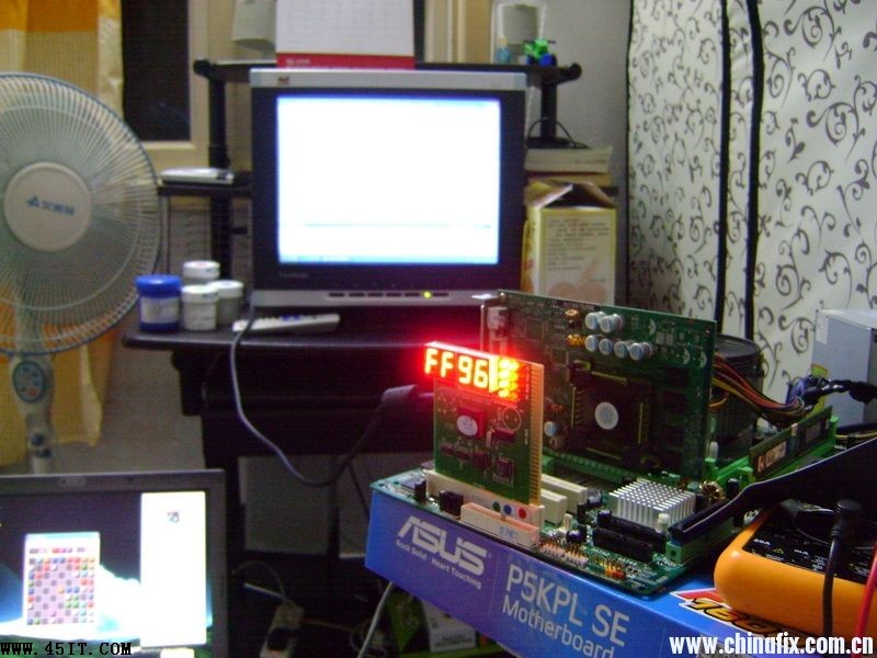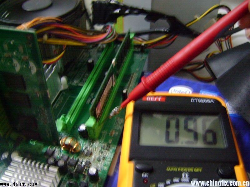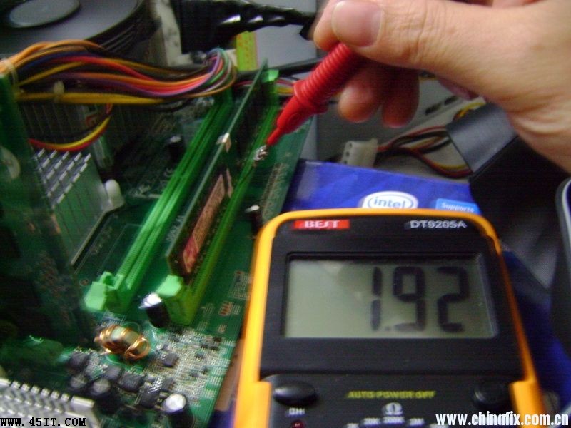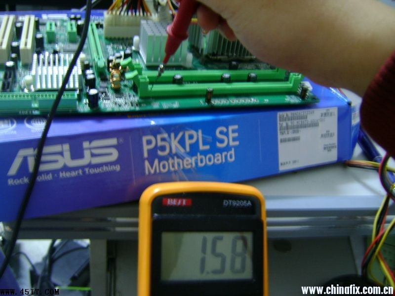 第一次見到二代內存電壓升到3.17V還能運行的主板,特發上來供大家共享一下。主板是映泰945PL- A7B的,客戶本來是到店里來換內存的,說是原來的內存不穩定,于是給了條1G/667的給裝上去了,開機運行一會兒藍屏了,關機拆內存,一摸非常燙手。于是查內存供電,果然相當不正常