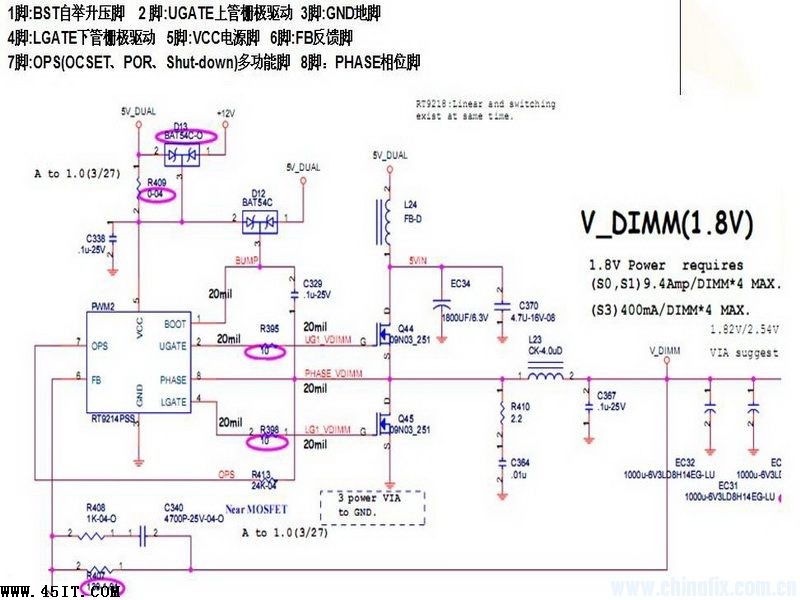 查旁邊的供電電路,是RT9214+兩個場管組成。典型的二代內存單 相供電電路。