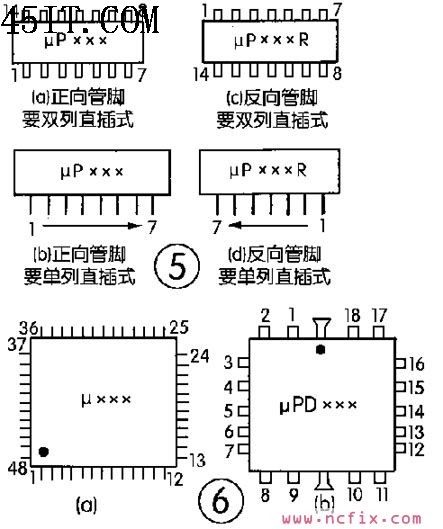 圖3、圖4是各種單列直插IC的管腳排序。數管腳時把IC的管腳向下,這時定位標記在左面(與雙列直插一樣),從左向右數,就得到管腳的排列序號。