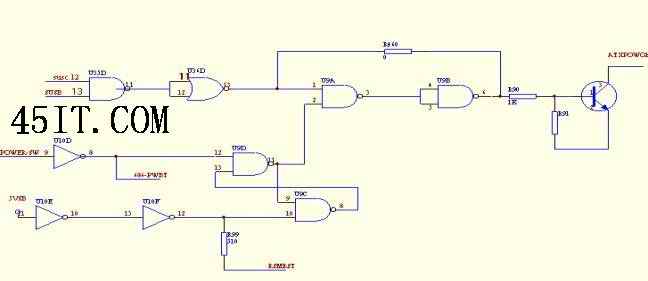 為了長時間保持通電,PW-ON信號必須恒低,可POWER開關送過來的是一個脈沖信號。這時就需要一個鎖定電路,只要接通電源,5VSB通過R98、C25的延時,再通過兩級整形放大,把一個稍微延時的恒高電平送到U9的10腳。U9的12腳接受了一個人工產生的、已經整形的負向脈沖,這個負向脈沖遠遲于U9的10腳高電平送達時間,當U9的12腳有負向脈沖時,U9的11腳便有正脈沖產生,這個正脈沖加到U9的9腳后。根據雙1得0的原理,U9的8腳便產生一個負的脈沖,只要U9的12腳的負脈沖寬度大于兩級與非門的延時,在U9的8腳產生的負脈沖在送到U9的13腳之時,只要12腳仍保持負電平,那么這個鎖定電路就成立了。