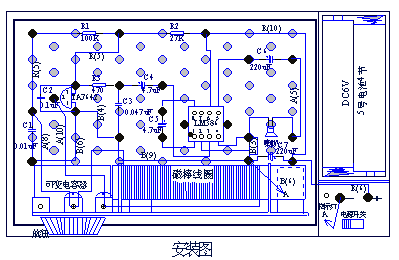 在初學電子知識時,為了安全和擴大普及面,讓更多年齡更小的學生能早一點接觸電子技術,我們選用了螺孔板作為基本的安裝模板,因此安裝圖也就變成另一種模式,如圖: