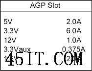 AGP顯卡供電:與我們通常認識的AGP供電不同的是,AGP供電并非完全是+3.3V。實際上,幾乎所有的電壓AGP都用到了。其中,+5V/2.0A,+3.3V/6.0A,+12V/1.0A,+3.3Vaux/0.375A,1.5V/2.0A。從這里可以看到,+3.3V還是主要的。我們把這幾組功率相加,可以得出結論,AGP最大供電能力是46W,也就是說,超過46W的顯卡都需要外接電源。如下圖: