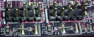 這種前置USB接口最常見,大多數(shù)主板都使用這種接口,有的還帶有插槽來限位。如:精英P6IEA,INTEL D845GLVA主板,L4IBMGL2(REV:1.0B),精英865PE-A(REV:2.0),捷波P4X400DA主板,捷波JP4MFM。