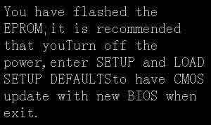 以上操作都完成后,程序會提示“用戶已經刷新了主板的Flash ROM內容,建議用戶關機,再次引導系統時,進入系統的BIOS設置程序,用LOAD SETUP DEFAULTS(加載默認的設置內容)來用新的BIOS將CMOS內容升級”(如下表)