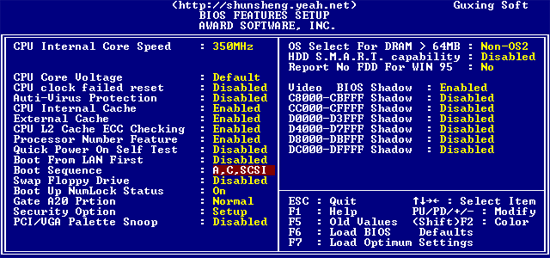 ENABLED是開啟,DISABLED是禁用,使用PAGE UP和PAGE DOWN可以在這兩者之間切換。CPU INTERNAL CORE SPEED:CPU 當前的運行速度;VIRUS WARNING:病毒警告;CPU INTERNAL CACHE/EXTERNAL CACHE(CPU內、外快速存取);CPU L2 GACHE ECC CHECKING (CPU L2『第二級緩存』快速存取記憶體錯誤檢查修正);QUICK POWER ON SELF TEST(快速開機自我檢測)此選項可以調整某些計算機自檢時檢測內存容量三次的自檢步驟;CPU UPDATE DATA(CPU更新資料功能);BOOT FROM LAN FIRST(網絡開機功能)此選項可以遠程喚醒計算機。