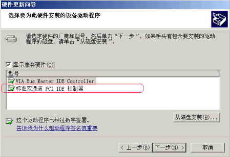 5)在“顯示兼容設備”窗口中選成“標準雙通道PCI IDE控制器”,按照指示完成安裝(圖5)。