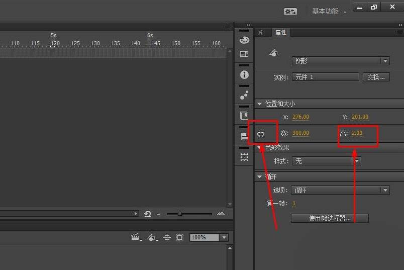 6、在第1幀選擇元件,在屬性面板設置元件高度為2像素