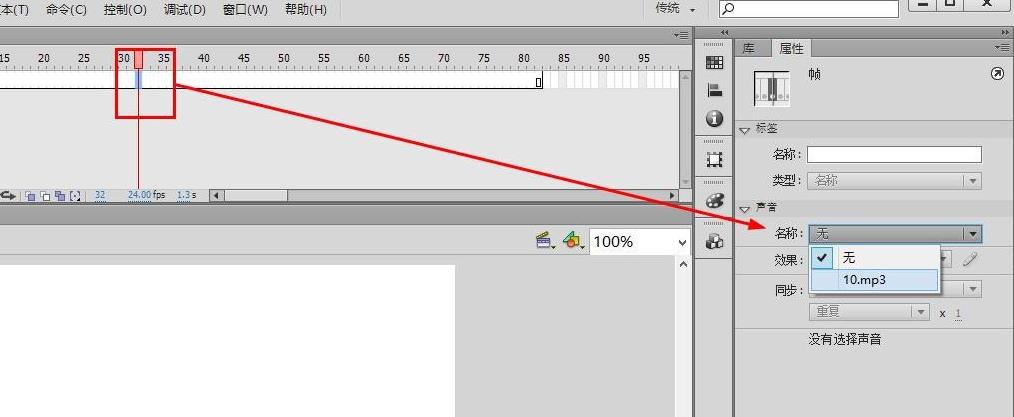 3、點擊時間軸的幀,在屬性面板中選擇聲音