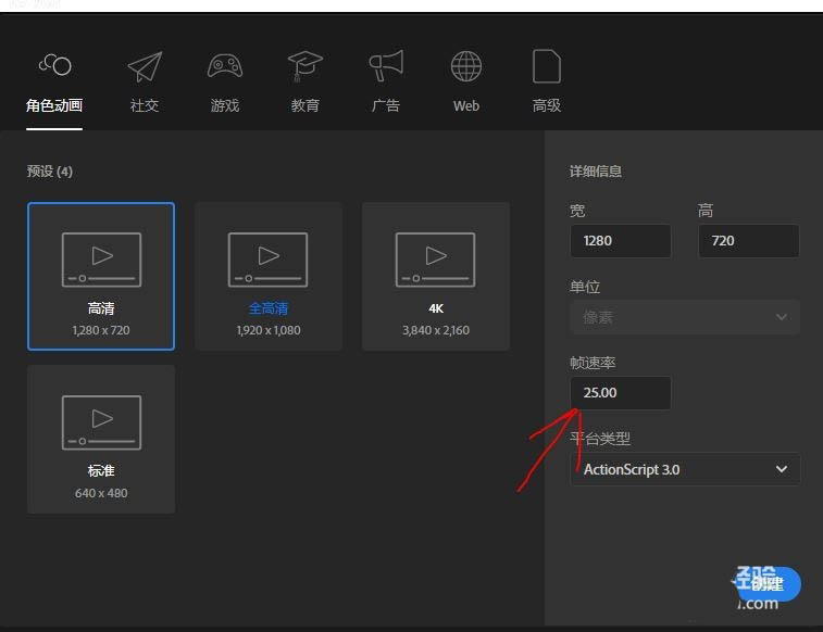 3、點(diǎn)擊后會(huì)跳出彈窗,我們可以在彈窗中找到 幀速率 并且更改它,我們調(diào)整到適合自己的幀速率 創(chuàng)建文件就可以了。