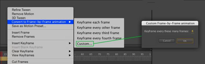 “ 修改”菜單中提供了“ 轉(zhuǎn)換為逐幀動(dòng)畫”選項(xiàng) 。您還可以在鍵盤快捷方式對(duì)話框中指定所需的鍵以執(zhí)行這些任務(wù)。