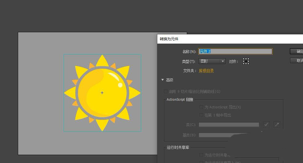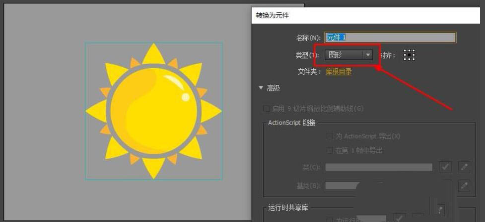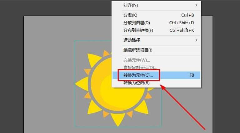 3、不同形態的太陽,需要不同的處理方式,這里就簡單講一下現有形狀的太陽制作方法。將素材轉換為元件,選擇圖形元件。