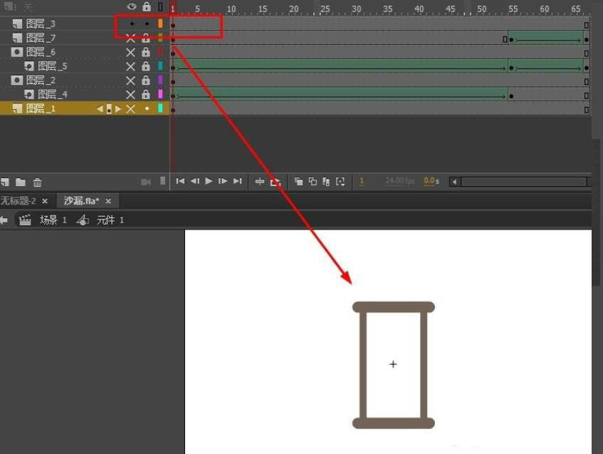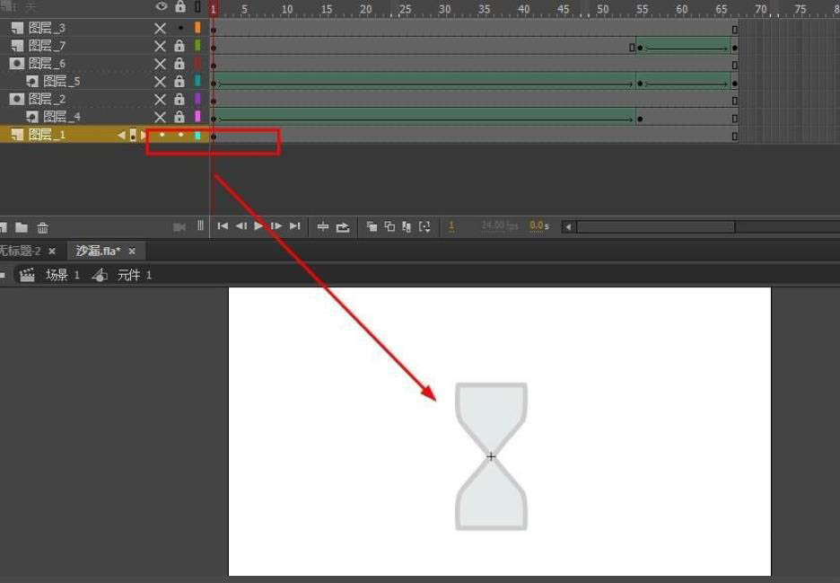 3、轉(zhuǎn)換為圖形元件,雙擊進(jìn)入編輯狀態(tài)。如圖所示,將沙漏先拆成兩個(gè)部分,外框和玻璃,分別放到最上層和最下層。