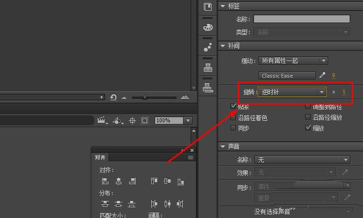 8、選擇補間幀,在屬性面板設置旋轉為逆時針,如圖所示