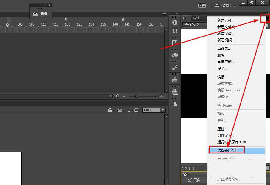 7、另外,可以點擊庫面板右上角的菜單按鈕,打開后點擊選擇未用項目,一次將所有的未用到的元件刪除,減小文件大小。