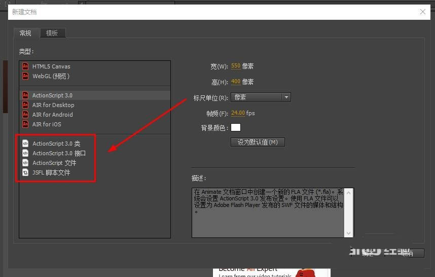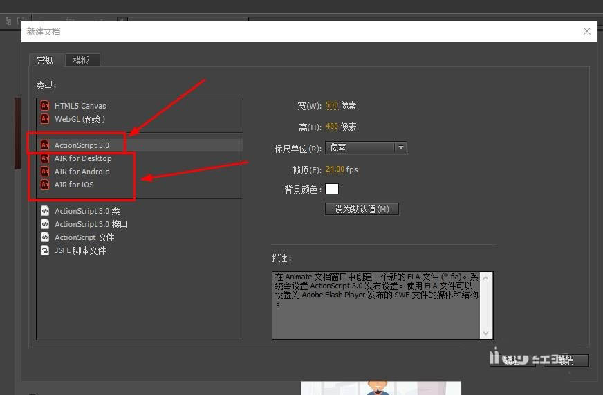 4、第2個區域是主要用到的幾個類型,Actionscript3.0,也就是AS3腳本,是制作動畫需要選擇在類型,之前的版本中還支持AS2,這里已經沒有了。下面的三個AIR for desktop,AIR for Android以及AIR for iOS,分別是制作桌面程序,安卓系統程序以及蘋果移動設備程序的文檔類型。