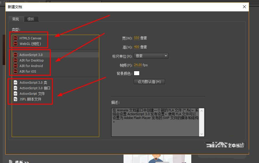 1、這里用的是Animate CC2018軟件,最新的2020l版本的新建畫面完全不同,打開軟件,ctrl+n打開創建面板,如圖所示