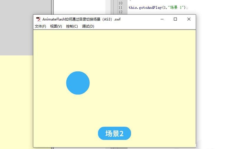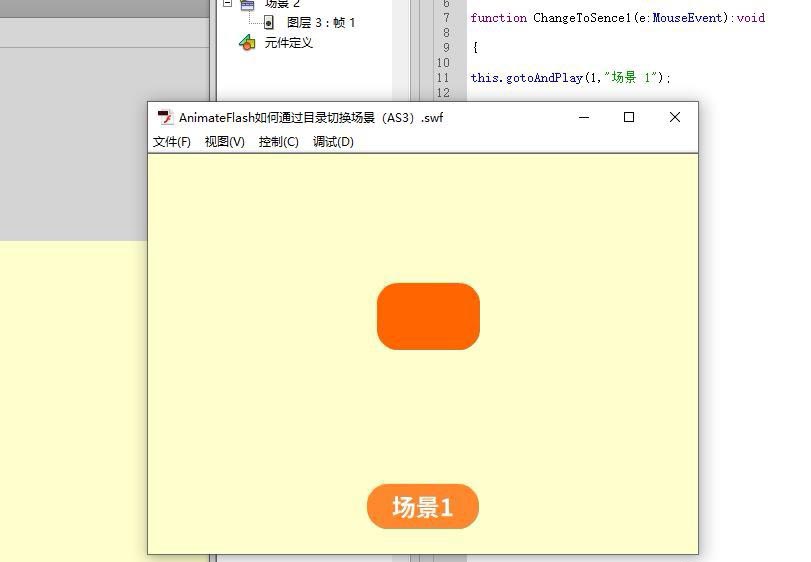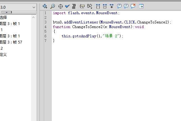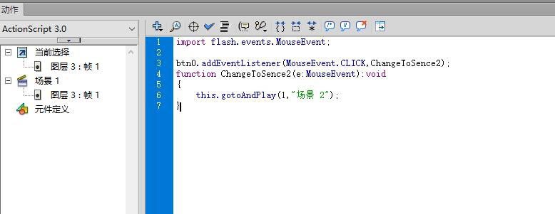 import flash.events.MouseEvent;btn0.addEventListener(MouseEvent.CLICK,ChangeToSence2);function ChangeToSence2(e:MouseEvent):void{this.gotoAndPlay(1,"場景 2");}//注意場景名中的空格