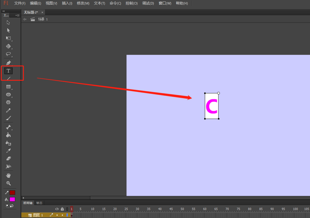 2、新建了flash畫布之后,在這個flash項目的工具欄中找到文本工具,選擇文本工具在畫布上單擊鼠標并輸入一個英文字母。