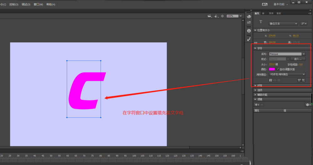 3、選中輸入的英文字母,打開字符窗口,在字符窗口中來設置這個英文字母的屬性,如文字大小顏色等。