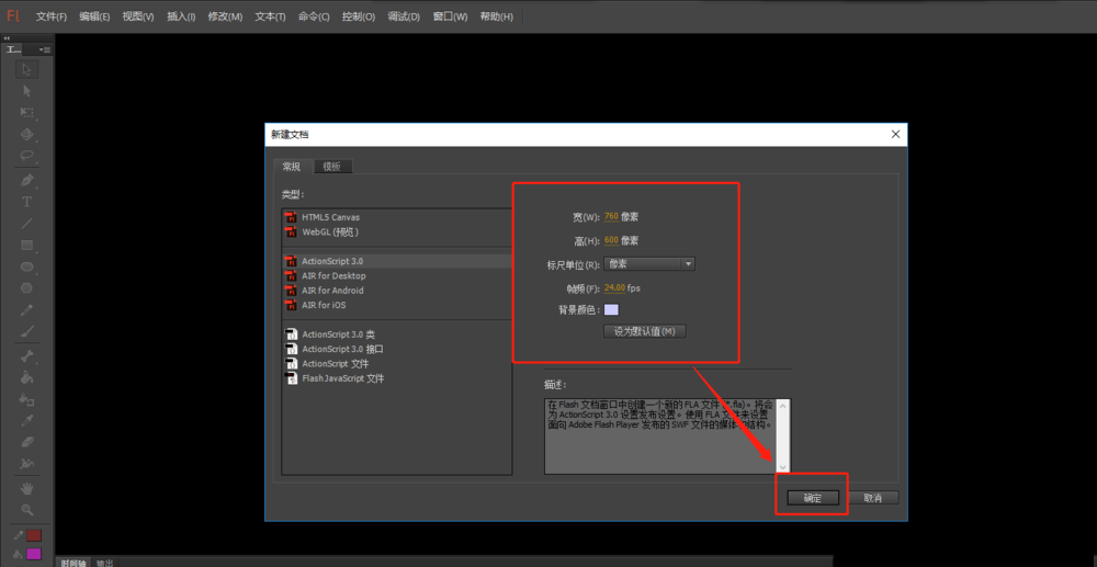 1、打開flash軟件,選擇文件菜單的新建選項,來新建一個flash畫布,并設置其參數。