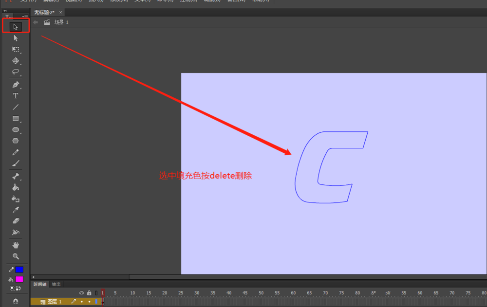 6、在用選擇工具單獨單擊選中英文字母的填充顏色,在按delete鍵將其刪除,這樣就得到一個無填充的英文字母。