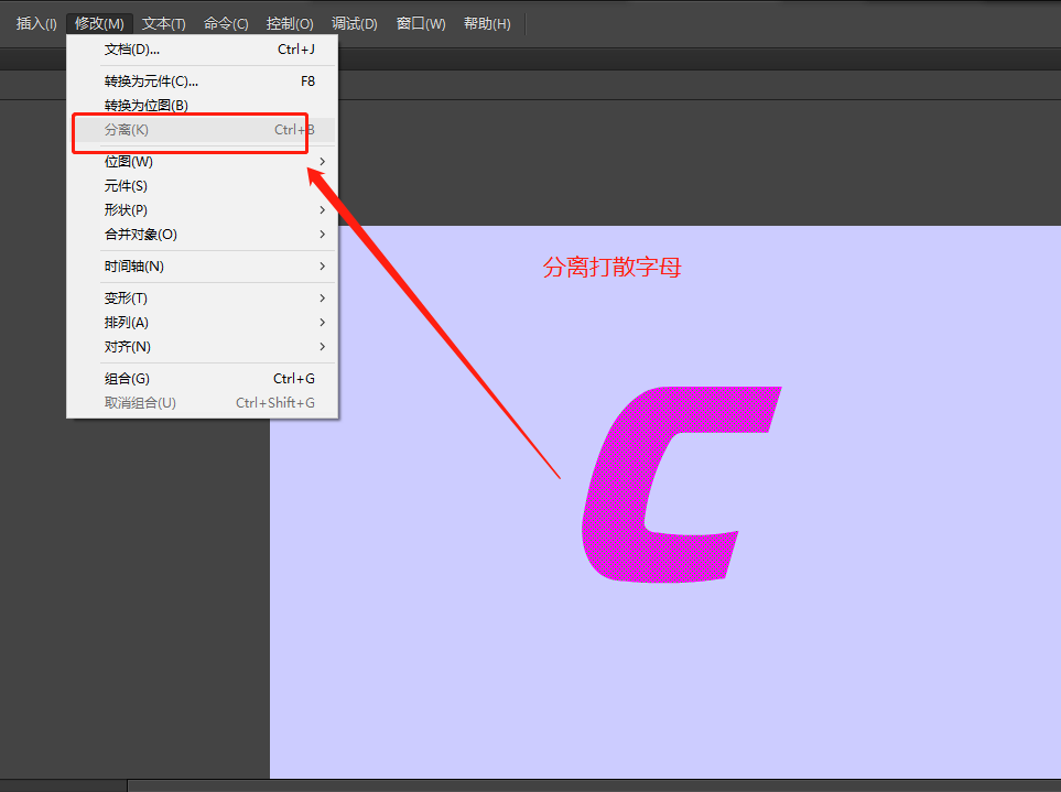 4、選中英文字母,執(zhí)行修改菜單欄中的分離命令,將英文字母給打散。