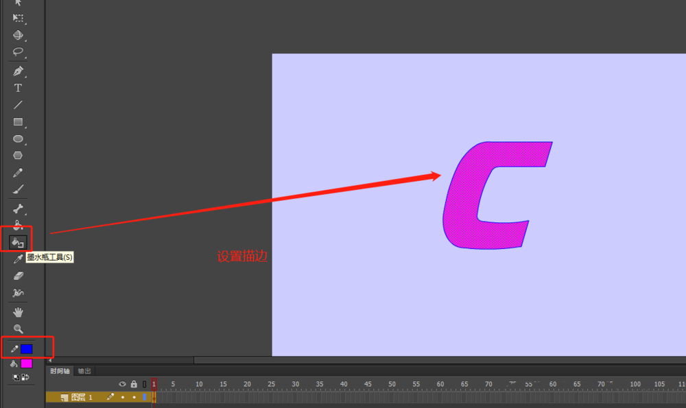 5、在工具欄中設置一個筆觸顏色,然后選擇墨水瓶工具,給這個英文字母設置一個描邊。