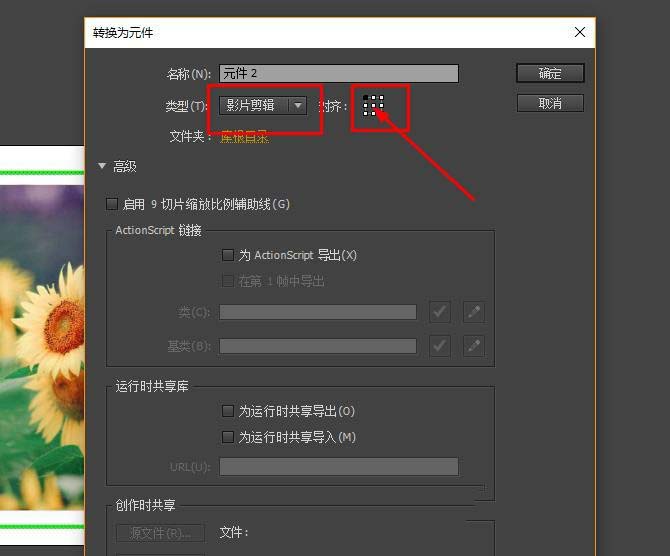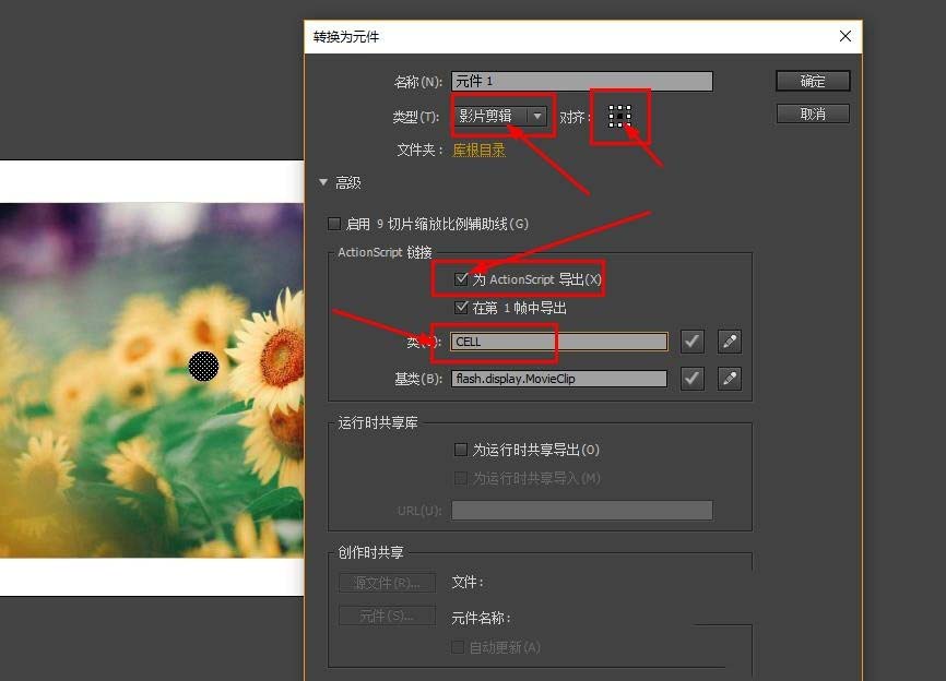 4、選擇圓轉(zhuǎn)換為影片剪輯,注意注冊(cè)點(diǎn)在中心,且要設(shè)置鏈接名為CELL