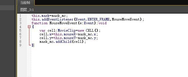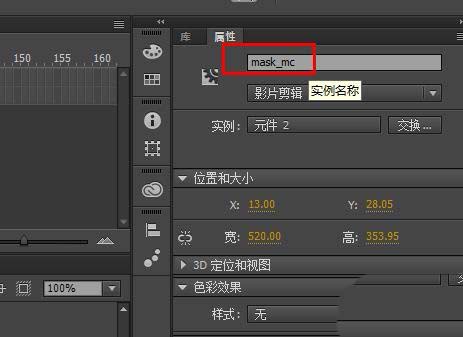 7、接下來(lái)設(shè)置矩形框的實(shí)例名為mask_mc,用作遮罩。這里使用代碼創(chuàng)建遮罩層。