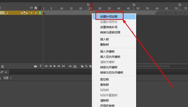 5、選擇幀右鍵選擇創建補間動畫,成功后如圖