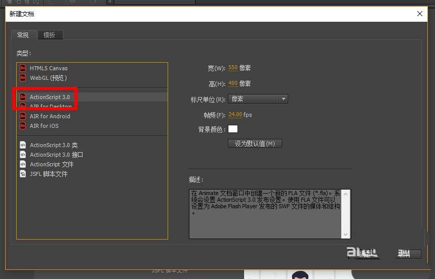 2、打開AnimateCC 軟件,新建AS3文檔。