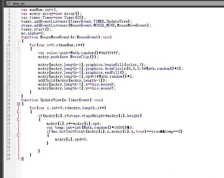 var maxNum:int=3;var mcAry:Array=new Array();var timer:Timer=new Timer(20);timer.addEventListener(TimerEvent.TIMER,UpdateView);stage.addEventListener(MouseEvent.MOUSE_MOVE,MouseMoveEvent);timer.start();mc.alpha=0;function MouseMoveEvent(e:MouseEvent):void{for(var i=0;i<maxNum;i++){var color:uint=Math.random()*0xffffff;mcAry.push(new MovieClip());mcAry[mcAry.length-1].graphics.beginFill(color,1);mcAry[mcAry.length-1].graphics.drawCircle(0,0,0.5+Math.random()*2);mcAry[mcAry.length-1].graphics.endFill();mcAry[mcAry.length-1].spd=1+Math.random()*2;addChild(mcAry[mcAry.length-1]);mcAry[mcAry.length-1].x=this.mouseX;mcAry[mcAry.length-1].y=this.mouseY;}}function UpdateView(e:TimerEvent):void{for(var i:int=0;i<mcAry.length;i++){if(mcAry[i].y<stage.stageHeight+mcAry[i].height){mcAry[i].y+=mcAry[i].spd;var temp:int=int(Math.random()*10000)%3;if(mc.hitTestPoint(mcAry[i].x,mcAry[i].y,true)==true&&temp==0){mcAry[i].spd=0;}}}}8、可以使用這個效果制作賀卡之類的動態(tài)效果。