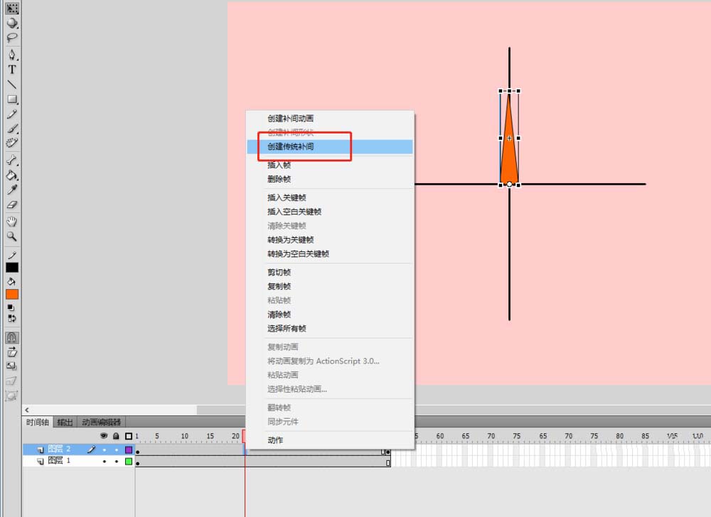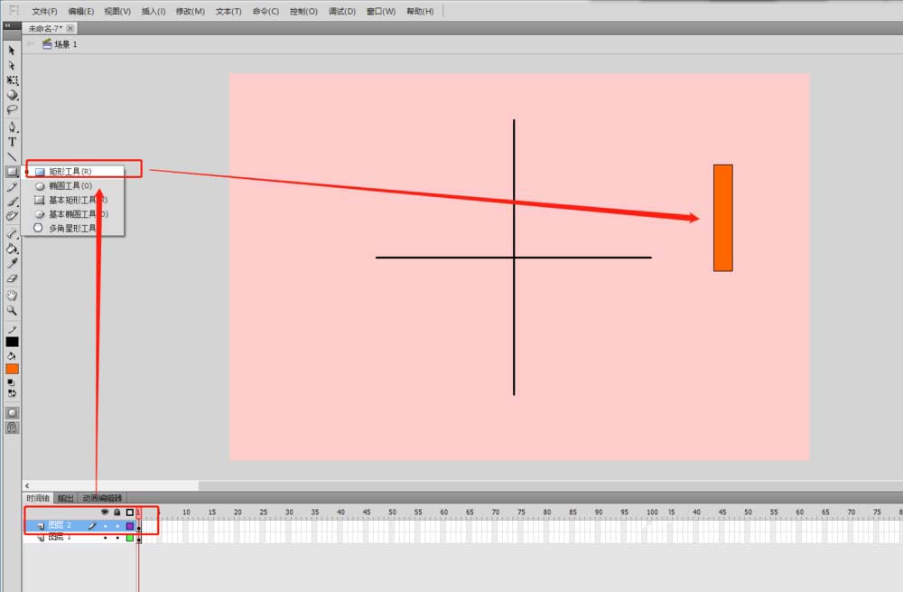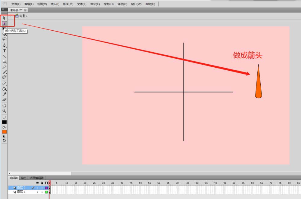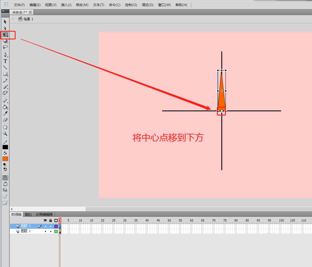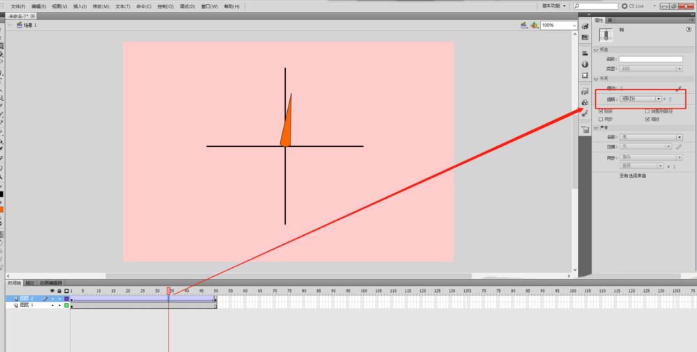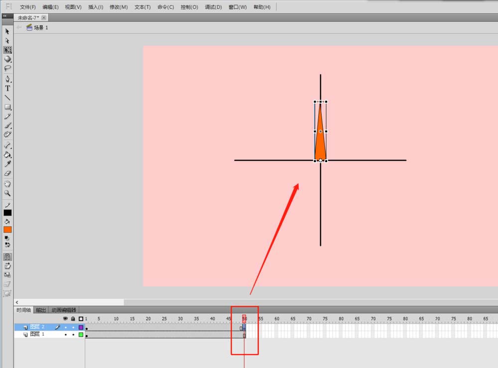 6、移動箭頭到十字中心位置,并選擇任意變形工具將箭頭變換的中心點移到下方;然后在圖層2即箭頭的第50幀插入關鍵幀;圖層1鍵十字線條的第50幀插入普通幀。