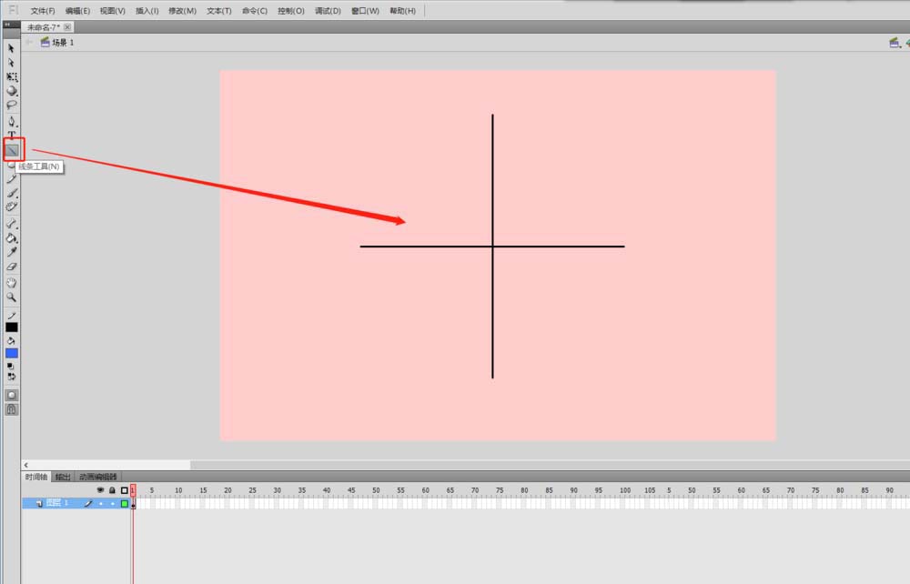 2、選擇工具欄中的線條工具,繪制一個十字的兩條線條,這兩個線條的交點就充當箭頭旋轉的中心點。