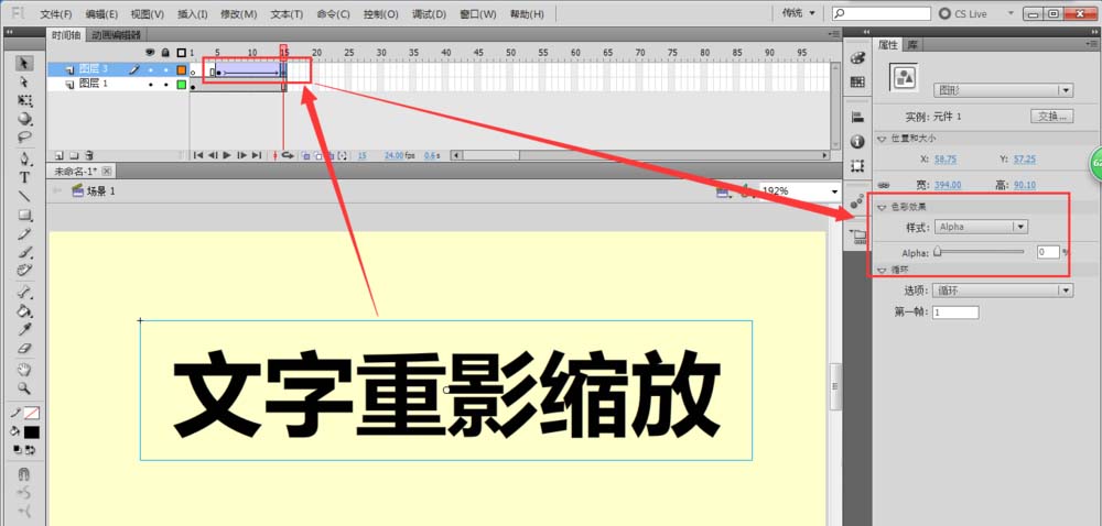 5、選中圖層2的第15關鍵幀,在屬性中將其alpha數值改為0,并且在圖層2兩個關鍵幀之間來創建傳統補間動畫。