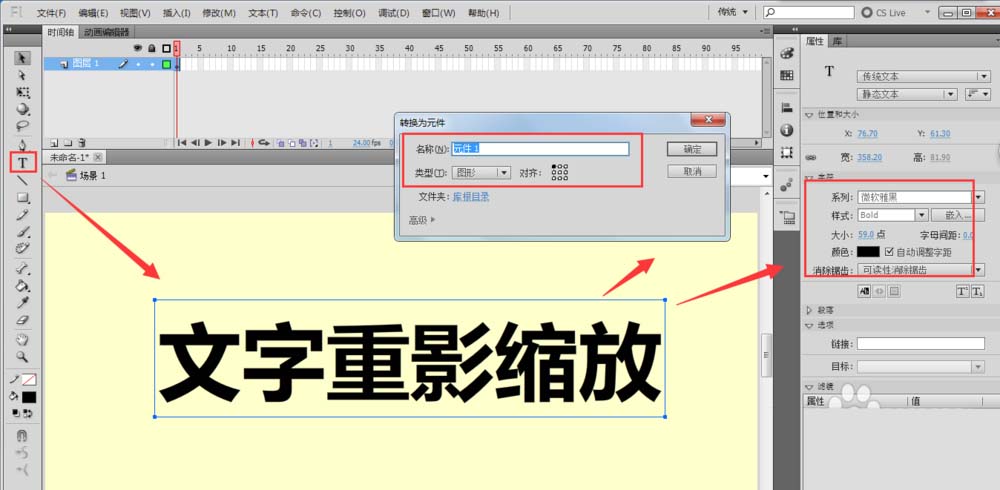 2、使用文本工具在舞臺上輸入文字,并在屬性面板中設置文字的屬性,然后選中文字按F8將其轉換一個圖形元件。
