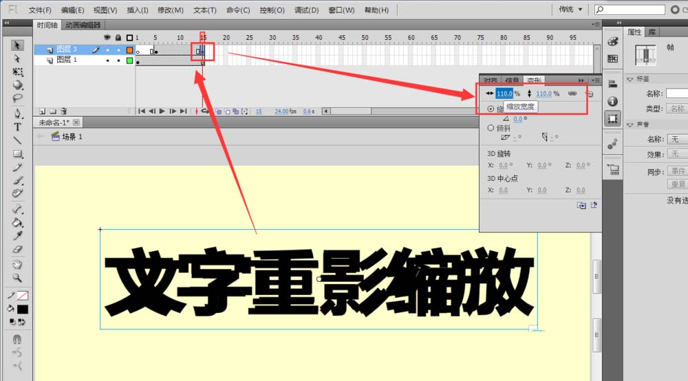 4、在圖層2的15幀插入關鍵幀,然后打開變形窗口,將圖層2的第15幀放大110%。
