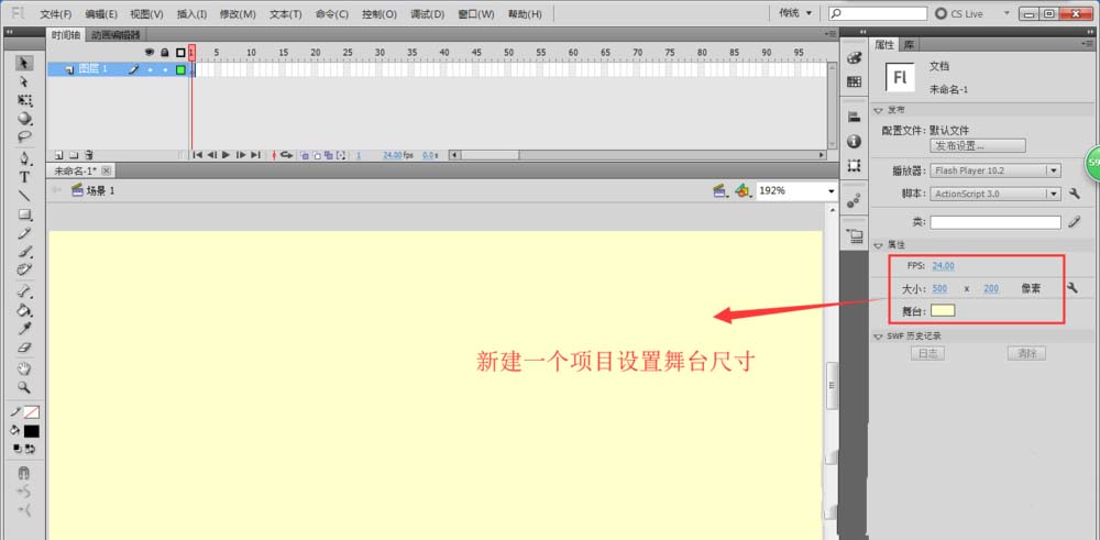 1、新建一個flash的動畫項目,并且設置這個動畫項目的舞臺屬性,如舞臺大小,舞臺顏色等。