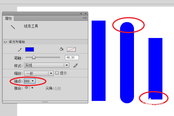 5、線條的線頭(端點)和接合方式默認是圓角的,這個線條比較粗的時候會比較明顯,你也可以根據自己的需要將它設置成方形。