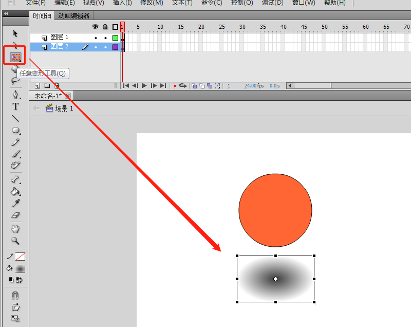 5、選中繪制的黑白徑向漸變填充的圓,使用任意變形工具將這個正圓壓扁成陰影的效果。