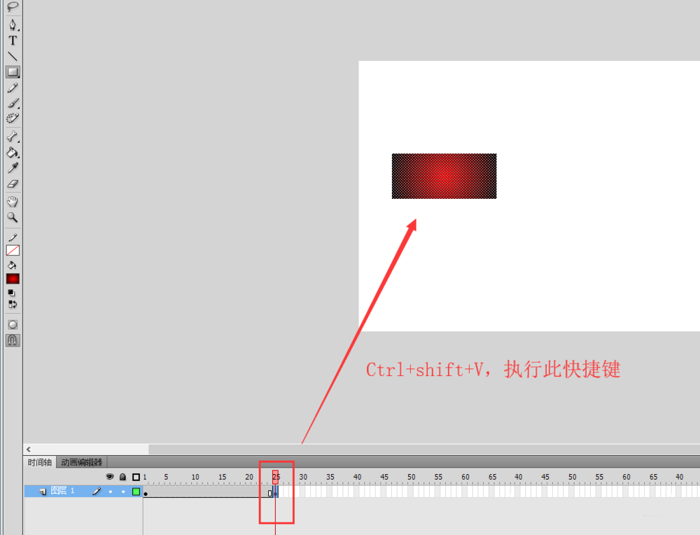 6、然后在選中第25幀空白關鍵幀,按快捷鍵Ctrl+shift+V執行原位置粘貼操作,就可以看到第1關鍵幀被原位置復制粘貼了。