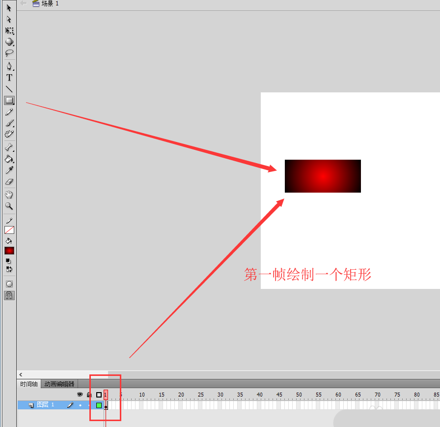 3、設置好之后,隨便在flash舞臺的某個位置上拖動鼠標左鍵繪制出一個矩形圖形出來。