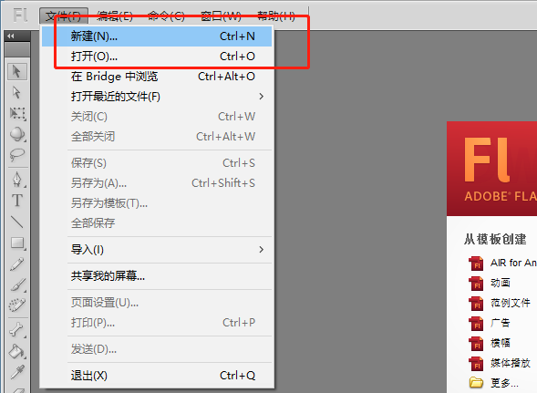 1、打開flash軟件,單擊展開文件菜單欄,在文件菜單欄中執行新建命令,來新建一個flash項目。
