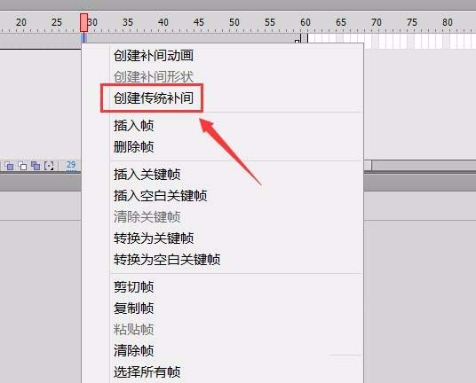 6、插入關鍵幀之后我們將立方體旋轉一定的角度,然后在第一幀和第六十幀之間按下鼠標右鍵在彈出的右鍵菜單里找到創建傳統補間動畫選項,如圖所示: