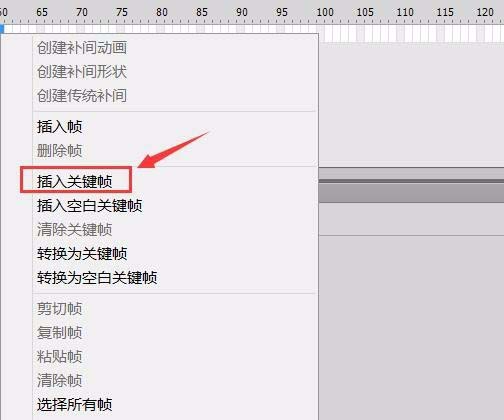 5、在時間軸的第一幀處,我們將剛剛制作的元件拖放到舞臺上,然后再在時間軸的第六十幀處按下鼠標右鍵在彈出的右鍵菜單里找到插入關鍵幀選項,如圖所示: