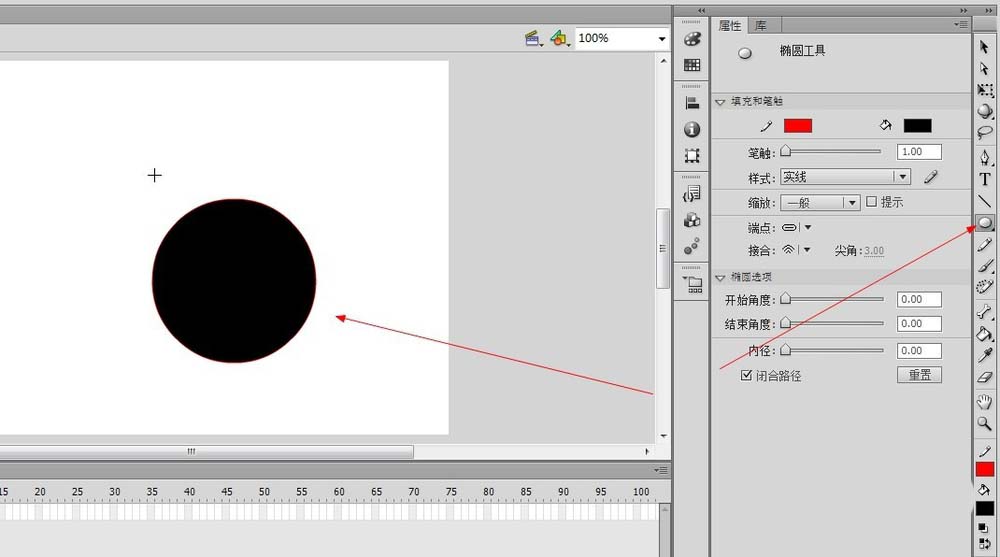 2、如圖所示,我們切換到橢圓工具之后,將鼠標移動到舞臺上,用十字狀的橢圓繪制工具,繪制一個橢圓。