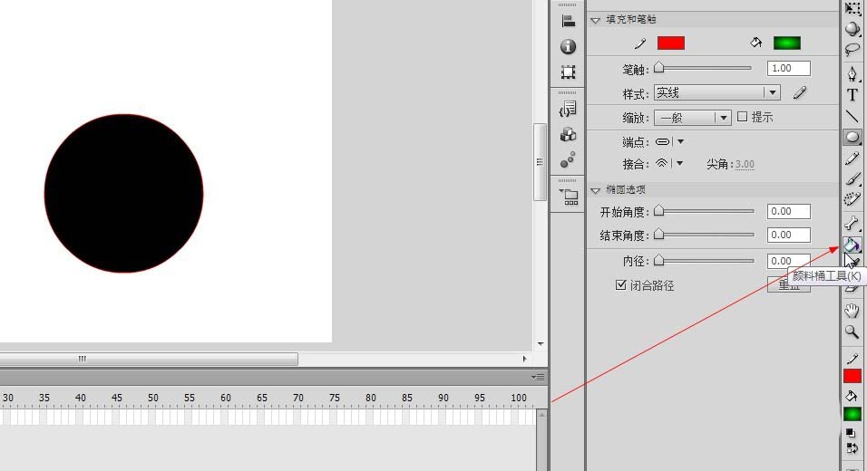3、如圖所示,我們點擊箭頭所指的顏料桶工具,來改變這個橢圓的填充色。